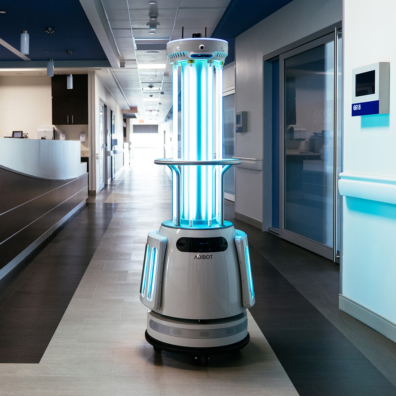 AIDBOT is an artificial intelligence-powered disinfection robot that combines ultraviolet light (UVC) and automated navigation technology to autonomously detect and disinfect indoor air and surfaces, effectively removing bacteria, viruses and other harmful microorganisms. The robot is able to assess the environment and develop disinfection paths in real time, ensuring that each area is thoroughly disinfected