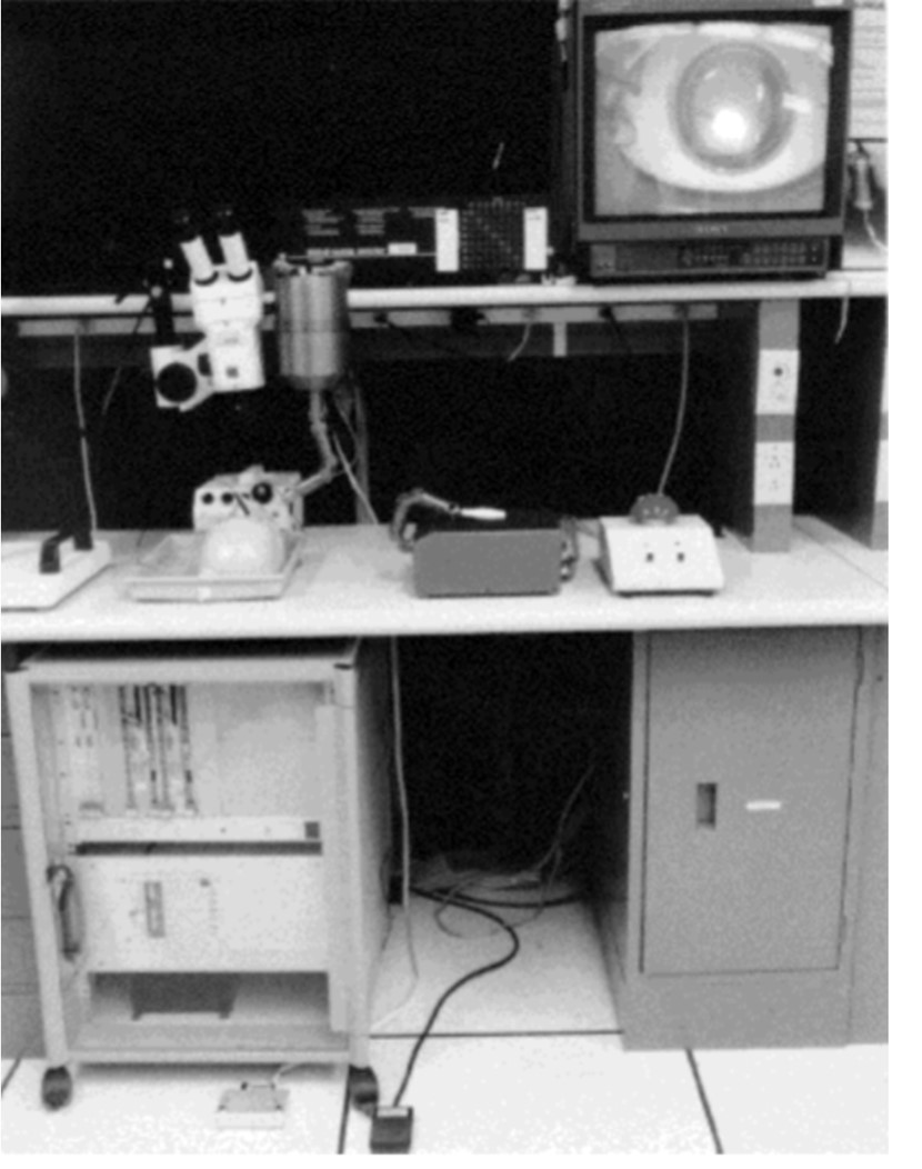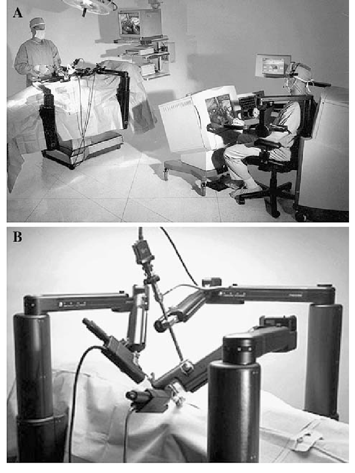 Zeus is divided into a Surgeon-side system and a Patient-side system. the Surgeon-side system consists of a pair of master hands and monitors that allow the physician to sit and control the master handles and view the patient's internal condition as captured by the endoscope through a monitor on the console. the Patient-side consists of two robotic arms for positioning and one robotic arm to control the position of the endoscope. Patient-side consists of two robotic arms for positioning and one robotic arm for controlling the position of the endoscope. The surgeon can vocally control the arm that operates the laparoscope, while operating the other two robotic arms by hand to perform the procedure.