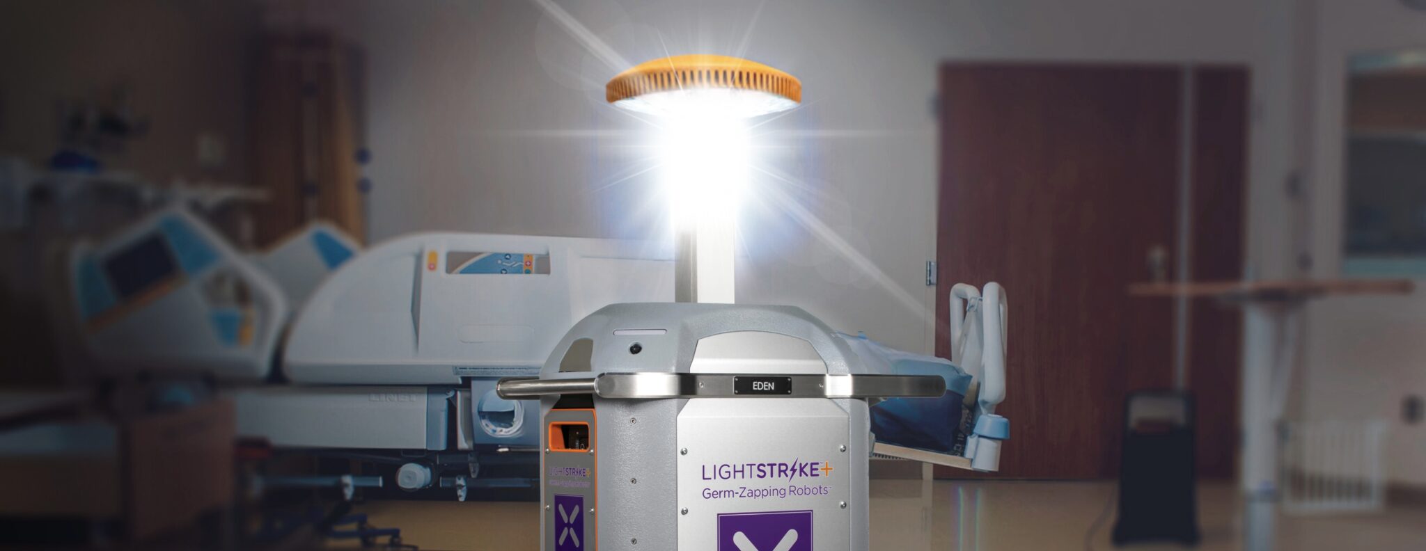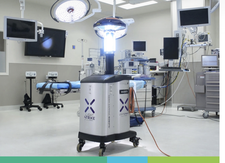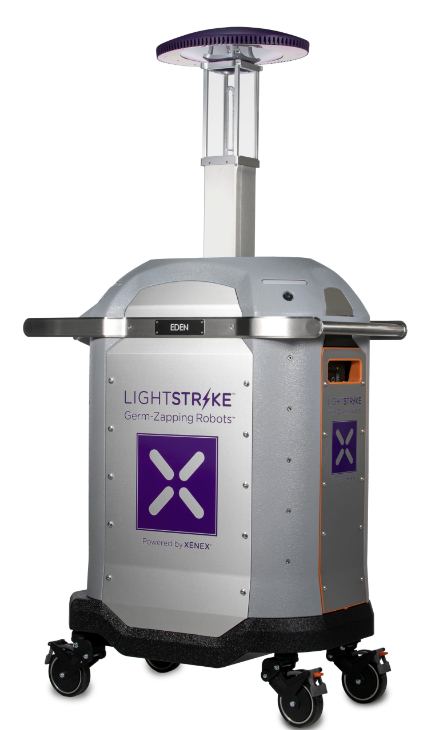 The Xenex LightStrike is a robot for sterilization, primarily used in hospitals and medical facilities. It uses high-intensity UV light exposure to destroy bacteria, viruses, and other pathogens to improve environmental hygiene and prevent the risk of infection. The LightStrike robot typically relies on its multi-directional UV lamps to disinfect in a short period of time, often covering a room in just a few minutes